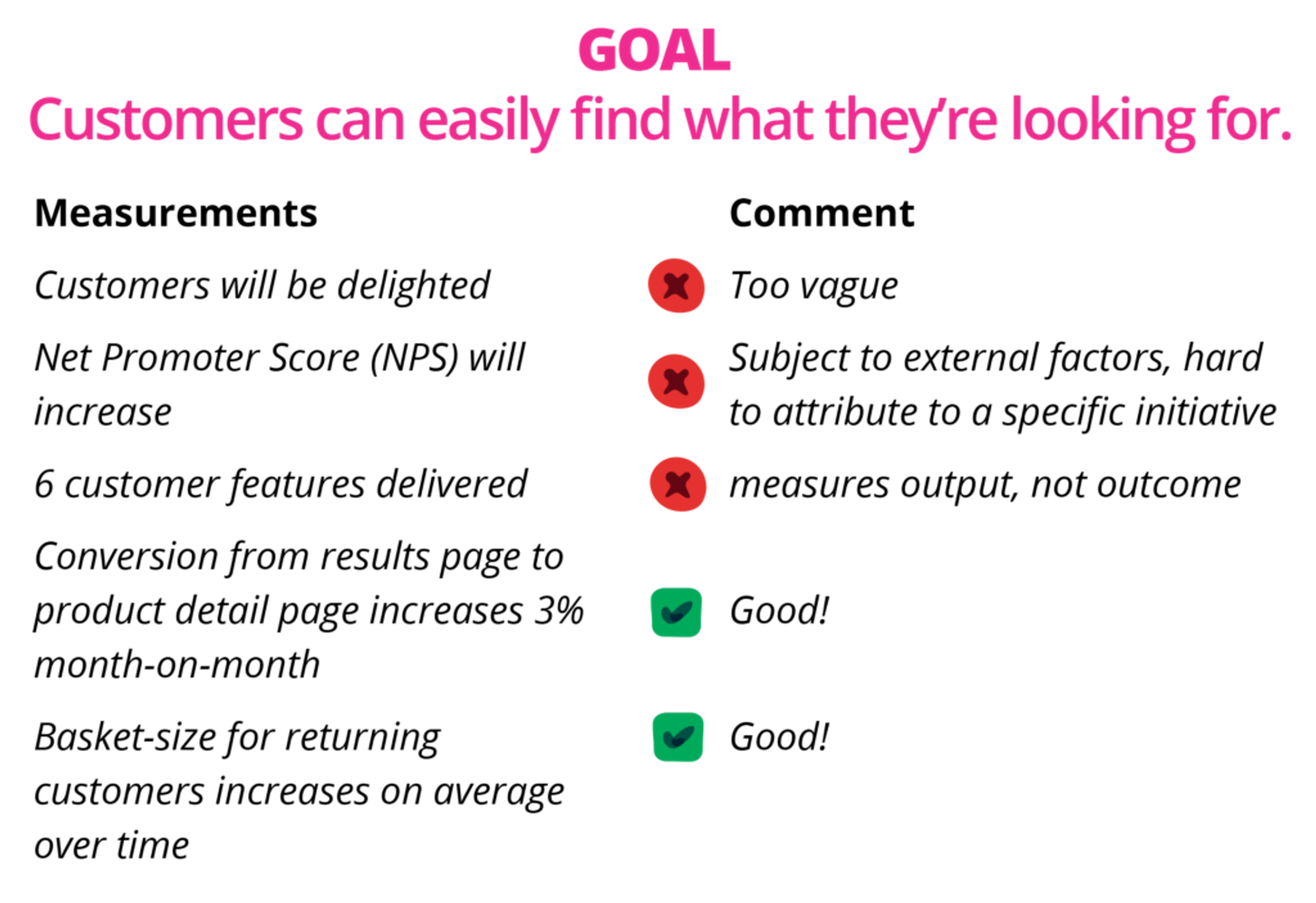 We all know that vanity metrics — like total page views, or total new customers — are pointless. But knowing what not to measure doesn’t make measuring the right things any easier. Even with the right motives, there are lots of ways we get it wrong. Suppose you’re operating an online store selling tens of thousands of unique items to all kinds of buyers. Making it easier for them to find what they’re looking for is one of your goals. Now try breaking that goal down into metrics that help you know if you’re on the right track.
